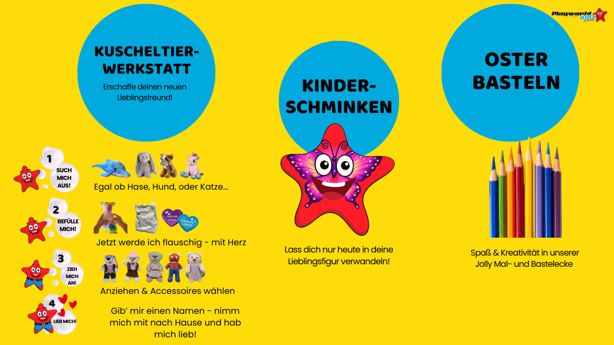 In den Osterferien wird es kreativ in der Playworld Wien! Freut euch auf liebevolle Bastelaktionen, Kinderschminken und unsere Kuscheltier-Werkstatt, bei der Kinder ihren eigenen flauschigen Lieblingsfreund gestalten können. Ein besonderes Ferienerlebnis voller Spaß, Kreativität und Osterfreude!
