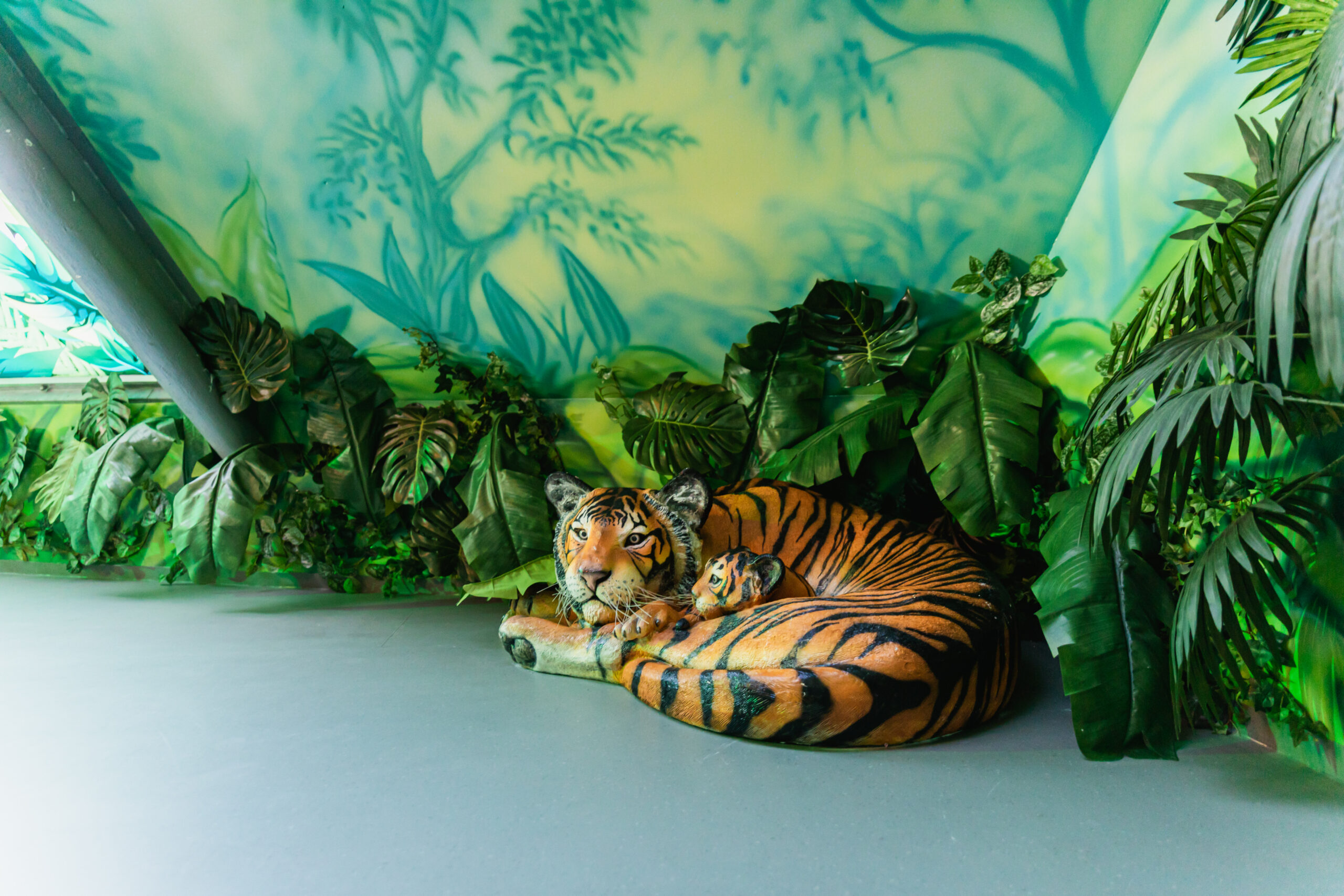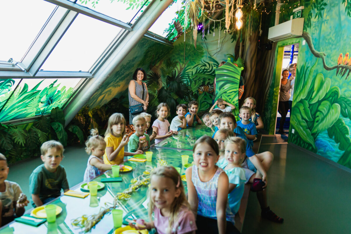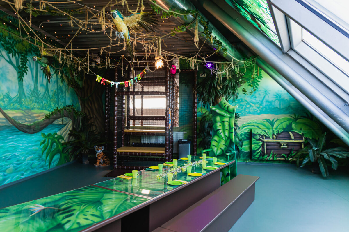 Begib dich auf eine Safari und triff auf tierische Freunde. Der Raum bietet Platz für bis zu 24 Kinder.